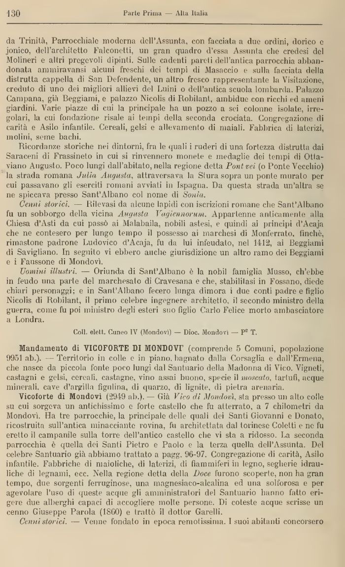 Vicoforte di Mondovi (2949 ab.). — Già Vico di Mondovi, sta presso un alto colle su cui sorgeva un antichissimo e forte castello che fu atterrato, a 7 chilometri da Mondovi. Ha tre parrocchie, la principale delle quali dei Santi Giovanni e Donato, ricostruita sull'antica minacciante rovina, fu architettata dal torinese Coletti e ne fu eretto il campanile sulla torre dell'antico castello che vi sta a ridosso. La seconda parrocchia è quella dei Santi Pietro e Paolo e la terza quella dell'Assunta. Del celebre Santuario già abbiamo trattato a pagg. 96-97. Congregazione di carità, Asilo infantile. Fabbriche di maioliche, di laterizi, di fiammiferi in legno, segherie idrauliche di legnami, ecc. Nella regione detta della Uoce furono scoperte, non ha gran tempo, due sorgenti ferruginose, una magnesiaco-alcalina ed una solforosa e per agevolare l'uso di queste acque gli amministratori del Santuario hanno fatto erigere due alberghi capaci di accogliere molte persone. Di coteste acque scrisse un cenno Giuseppe Parola (1SG0) e trattò il dottor Garelli