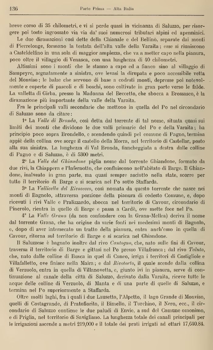 2° La Valle del Gfilandone piglia nome dal torrente Ghiandone, formato da due rivi, la Chiapperā e l'Infernotto, che confluiscono nell'abitato di Barge II Ghiandone, inalveato in gran parte, ma quasi sempre asciutto nella state, scorre per tutto d territorio di Barge e si scarica nel Po sotto Staffarda.