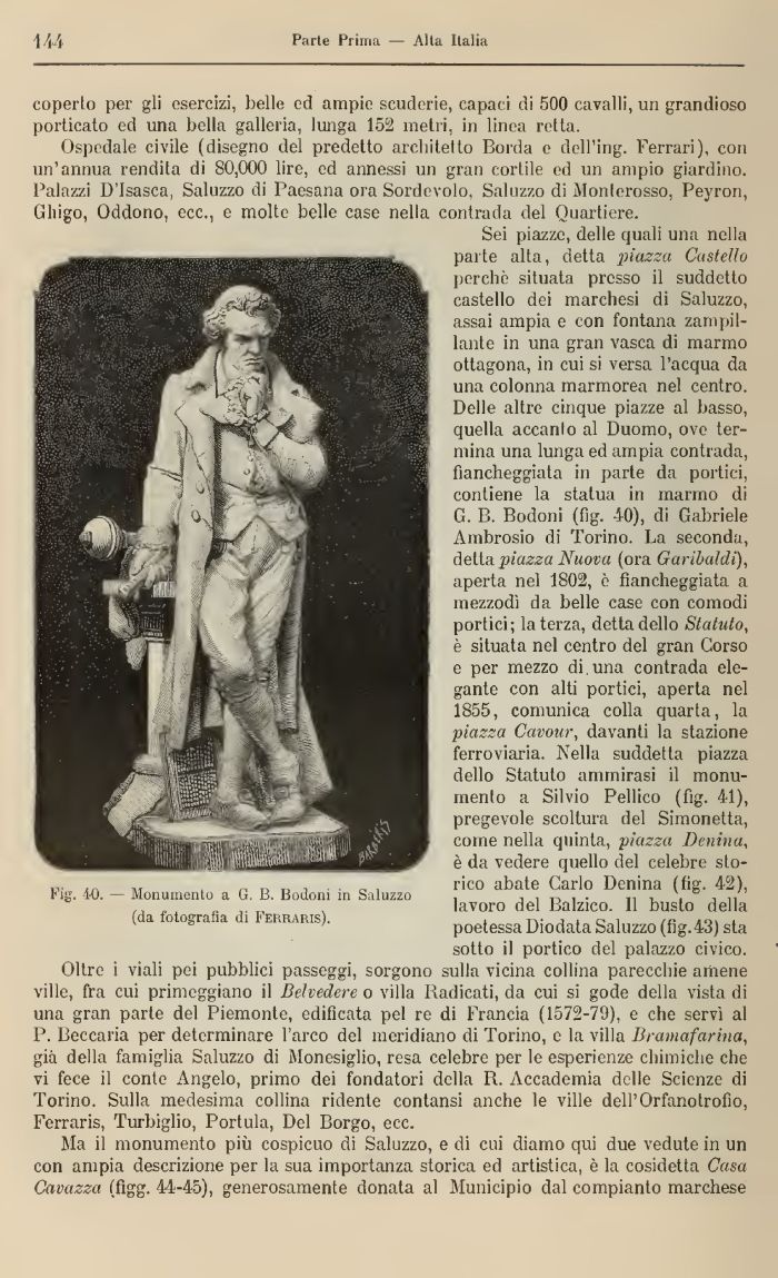 Sei piazze, delle quali una nella parte alta, detta piazza Castello perchè situata presso il suddetto castello dei marchesi di Saluzzo, assai ampia e con fontana zampillante in una gran vasca di marmo ottagona, in cui si versa l'acqua da una colonna marmorea nel centro. Delle altre cinque piazze al basso, quella accanio al Duomo, ove termina una lunga ed ampia contrada, fiancheggiata in parte da portici, contiene la statua in marmo di G. B. Bodoni (fig. 40), di Gabriele Ambrosio di Torino. La seconda, detta piazza Nuova (ora Garibaldi), aperta nel 1802, è fiancheggiata a mezzodì da belle case con comodi portici; Laterza, detta dello Statuto, è situata nel centro del gran Corso e per mezzo di.una contrada elegante con alti portici, aperta nel 1855, comunica colla quarta, la piazza Cavour, davanti la stazione ferroviaria. Nella suddetta piazza dello Statuto ammirasi il monumento a Silvio Pellico (fig. 41), pregevole scoltura del Simonetta, come nella quinta, piazza Dettiti a, è da vedere quello del celebre storico abate Carlo Denina (fig. 42), lavoro del Balzico. Il busto della poetessa Diodata Saluzzo (fig.43) sta sotto il portico del palazzo civico.