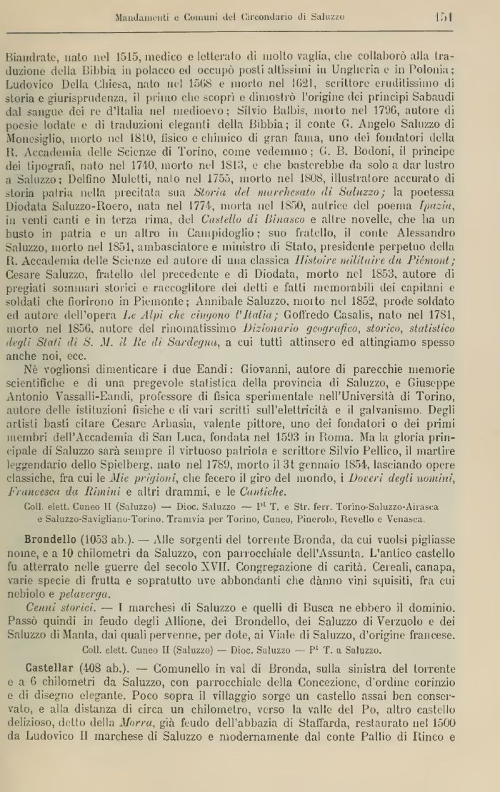 Diandra te, nato nel 1515, medico e Letterato di molto vaglia, che collaboro alla traduzione della Bibbia in polacco ed occupò posti altissimi in Ungheria e m Polonia; Ludovico Della Chiesa, nato nel 15(18 e morto nel USI, scrittore eruditissimo di storia e giurisprudenza, il primo che scoprì e dimostrò l'origine dei principi Sabaudi dal sangue dei re d'Italia nel medioevo; Silvio Balbis, morto nel 1796, autore di poesie lodate e di traduzioni eleganti della Bibbia; il conte G. Angelo Saluzzo di Monesiglio, morto nel 1810, fisico e chimico di gran fama, uno dei fondatoli della 11. Accademia delle Scienze di Torino, come vedemmo; G. B. Bodoni, il principe dei tipografi, nato nel 1710, morto nel 1813, e che basterebbe da solo a dar lustro a Saluzzo; Delfino Muletti, nato nel 1755, morto nel 1808, illustratore accurato di storia patria nella precitata sua Storia del marchesato di Saluzzo; la poetessa Diodata Saluzzo-Roero, nata nel 1771, morta nel 1850, autrice del poema Fpazia, in venti canti e in terza rima, del Castello di liinasco e altre novelle, che ha un busto in patria e un altro in Campidoglio ; suo fratello, il conte Alessandro Saluzzo, niorlo nel 1851, ambasciatore e ministro di Stalo, presidente perpetuo della B. Accademia delle Scienze ed autore di una classica IKséviré mìliUiire da Piémunt ; Cesare Saluzzo, fratello del precedente e di Diodata, morto nel 1853, autore di pregiati sommari storici e raccoglitore dei detti e fatti memorabili dei capitani e soldati che fiorirono in Piemonte ; Annibale Saluzzo. morto nel 1852, prode soldato ed autore dell'opera Le Alpi che cingono VItalia; Goffredo Gasalis, nato nel 1781, morto nel 1856, autore del rinomatissimo Dizionario geografico, dorico, statistico degli Stati di S. M. il Ite di Sardegna, a cui tutti attinsero ed attingiamo spesso anche noi, ecc.