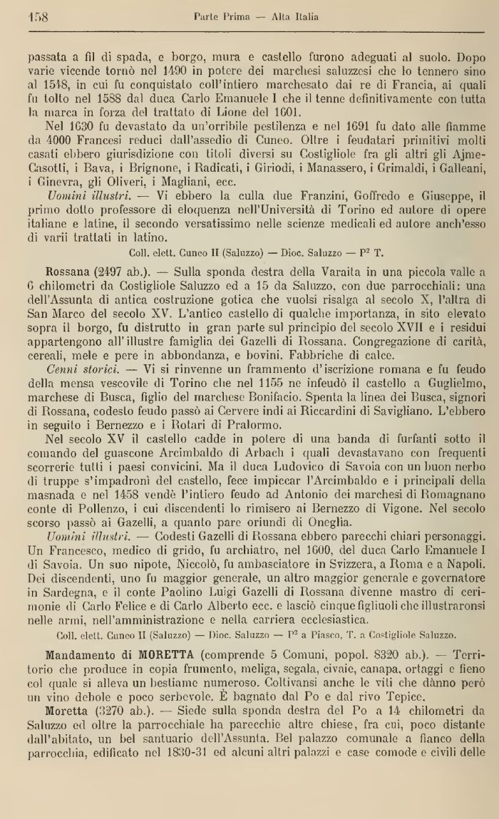 Rossana (2497 ab.). — Sulla sponda destra della Varaita in una piccola valle a G chilometri da Costigliele Saluzzo ed a 15 da Saluzzo, con due parrocchiali: una dell'Assunta di antica costruzione gotica che vuoisi risalga al secolo X, l'altra di San Marco del secolo XV. L'antico castello di qualche importanza, in sito elevato sopra il borgo, fu distrutto in gran parte sul principio del secolo XVII e i residui appartengono all' illustre famiglia dei Gazelli di Rossana. Congregazione di carità, cereali, mele e pere in abbondanza, e bovini. Fabbriche di calce.