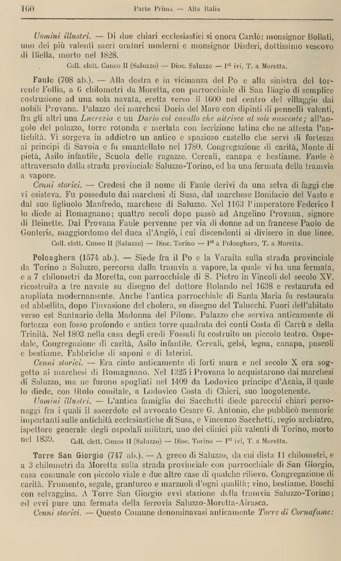 Uomini illustri. — L'antica famiglia dei Sacchetti diede parecchi chiari personaggi fra i quali il sacerdote ed avvocato Cesare G. Antonio, che pubblicò memorie importanti sulle antichità ecclesiastiche di Susa, e Vincenzo Sacchetti, regio archi atro, ispettore generale degli ospedali militari, uno dei clinici più valenti di forino, morto nel 1839. CSolI, cieli. Cuneo 11 (Saluzzo) — Dioc. Torino — Ps ivi, T. a Moretta.
