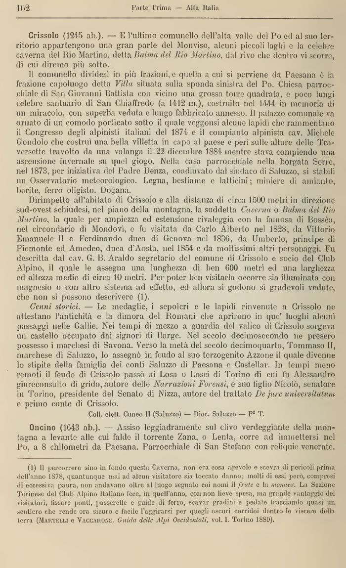 Crissolo (1245 ab.). — E l'ultimo co mundio dell'alta valle del Po ed al suo territorio appartengono una gran parte del Monviso, alcuni piccoli laghi e la celebre caverna del Hio Martino, detta Ba Ima del Rio Martino, dal rivo clic dentro vi scorre, eli cui diremo più sotto.