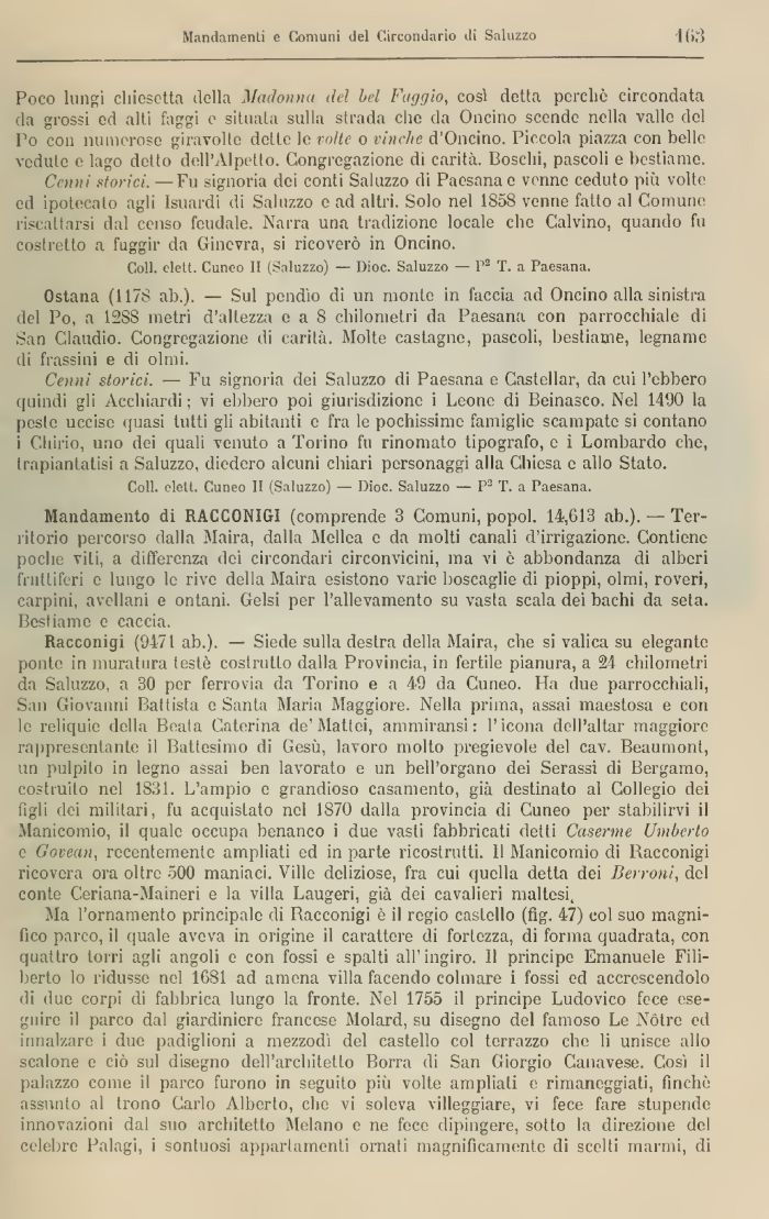 Racconigi (0471 ab.). — Siede sulla destra della Maira, che si valica su elegante ponte in muratura testé costrutto dalla Provincia, in fertile pianura, a chilometri da Saluzzo, a 30 per ferrovia da Torino e a 49 da Cuneo. Ha due parrocchiali, S m Giovanni Battista e Santa Maria Maggiore. Nella prima., assai maestosa e con le reliquie della Beata Caterina de' Malici, ammiratisi : l'icona dell'aitar maggiore rappresentante il Battesimo di Gesù, lavoro molto pregievole del cav. Beaumont, un pulpito in legno assai ben lavorato e un bell'organo dei Serassi di Bergamo, costruito nel 1831. L'ampio e grandioso casamento, già destinato al Collegio dei figli dei militari, fu acquistato nel 1870 dalla provincia di Cuneo per stabilirvi il Manicomio, il quale occupa benatico i due vasti fabbricati detti Caserme Umberto e Governi, recentemente ampliati ed in parte ri costrutti. Il Manicomio di Racconigi ricovera ora oltre 500 maniaci. Ville deliziose, fra cui quella detta dei Berroni, del conte Ceriana-Maineri e la villa Laugeri, già dei cavalieri maltesi,