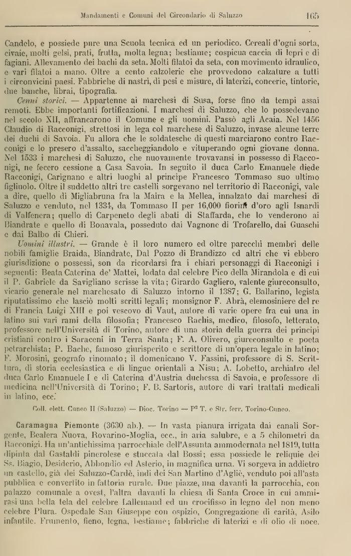 Caramagna Piemonte (3030 ab.). — In vasta pianura irrigata dai canali Sorgente, Bealera Nuova, Rovarino-Moglia, ecc., in aria salubre, e a 5 chilometri da llacconigi. Ha un'antichissima parrocchiale dell'Assunta ammodernata nel 1810, tutta dipinta dal Gastaldi pinerolese e stuccala dal Bossi; essa possiede le reliquie dei Ss. Riagio, Desiderio, Abbondio ed Aslerio, in magnifica urna. Vi sorgeva in addietro un castello, già dei Salnzzo-Cardè, indi dei San Martino d'Aglio, venduto poi all'asta pubblica e convertito in fattoria rurale. Due piazze, una davanti la parrocchia, con palazzo comunale a ovest, l'altra davanti la chiesa di Santa Croce in cui ammirasi una bella tela del celebre Lallemand ed un crocifisso in legno del non meno celebre Plura. Ospedale San Giuseppe con ospizio, Congregazione di carità, Asilo infantile. Frumento, fieno, legna, bestiame; fabbriche di laterizi e di olio di noce.