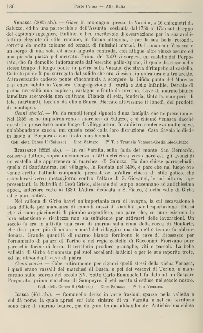 Venasca (3065 ab.). — Giace in montagna, presso la Varaita, a 16 chilometri da Saluzzo, ed ha una parrocchiale dell'Assunta, costruita dal 1750 al 1755 sul disegno del capitano ingegnere Ruffino, e ben meritevole di osservazione per la sua architettura elegante di stile romano, in forma ottagona, e per la sua bella rotonda, sorretta da molte colonne ed ornala di finissimi marmi. Del rimanente Venasca è un borgo di una sola ed assai angusta contrada, con afligue altre viuzze oscure ed una piccola piazza pel mercato. Prima del 1500 vi sorgeva un castello dei Porporato, che fu demolito intieramente dall'esercito gallo-ispano, il quale distrusse nello stesso tempo il lungo ponte in pietra sulla Varaita che stava dirimpetto al castello. Codesto ponte fu poi surrogato dal solido che ora vi esiste, in muratura e a Ire arcate. Attraversando codesto ponte s'incomincia a scorgere la bifida punta del Monviso e si entra subito in Venasca. Congregazione di carità e Asilo infantile. Derrate di prima necessità non copiose ; castagne e frutta da inverno. Cave di marino bianco lamellare saccaroide, non coltivate. Filanda di seta, fonderia, tintoria, stamperia di tele, martinetti, torchio da olio e Banca. Mercato attivissimo il lunedì, dei prodotti di montagna.