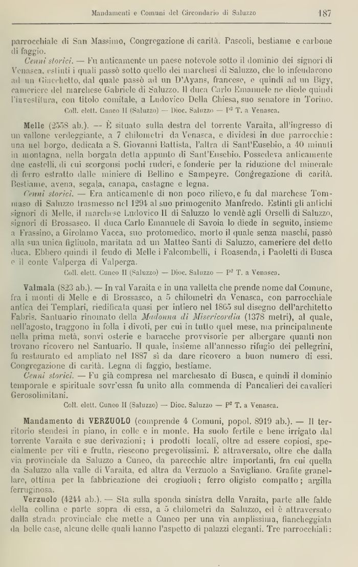 Mandamento di VERZUOLO (comprende 4 Comuni, popol. 8919 ab.). — Il ter-ritorio stendesi 111 piano, in colle e in monte. Ha suolo fertile e bene irrigato dal torrente Varaita e sue derivazioni; i prodotti locali, oltre ad essere copiosi, specialmente per viti e frutta, riescono pregevolissimi. E al traversato, oltre che dalla via provinciale da Saluzzo a Cuneo, da parecchie altre importanti, fra cui quella da Saluzzo alla valle eli Varaita, ed altra da Verzuolo a Savigliano. Grafite granellare, ottima perla fabbricazione dei crogiuoli; ferro oligisto compatto; argilla ferruginosa.