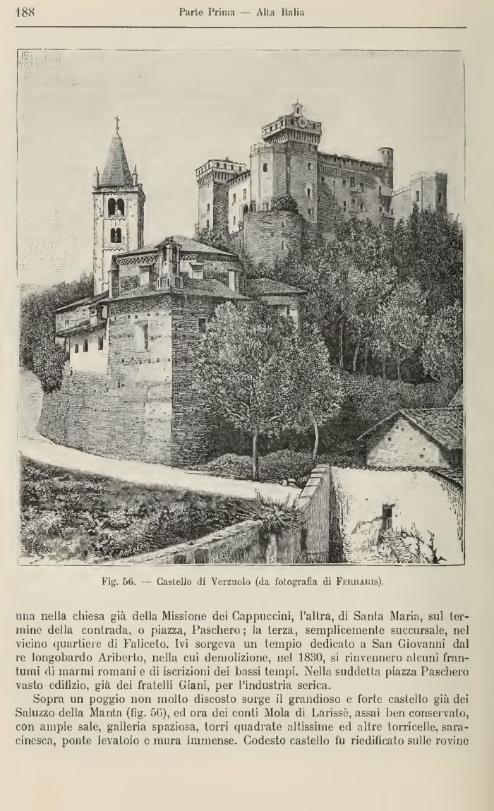 Sopra un poggio non molto discosto sorge il grandioso e forte castello gią dei Saluzzo della Manta (flg. 50), eil ora dei conti Mola di Larissč, assai ben conservalo, con ampie sale, galleria spaziosa, torri quadrate altissime ed altre torricelle, saracinesca, ponte levatoio e mura immense. Codesto castello fu riedificato sulle rovine