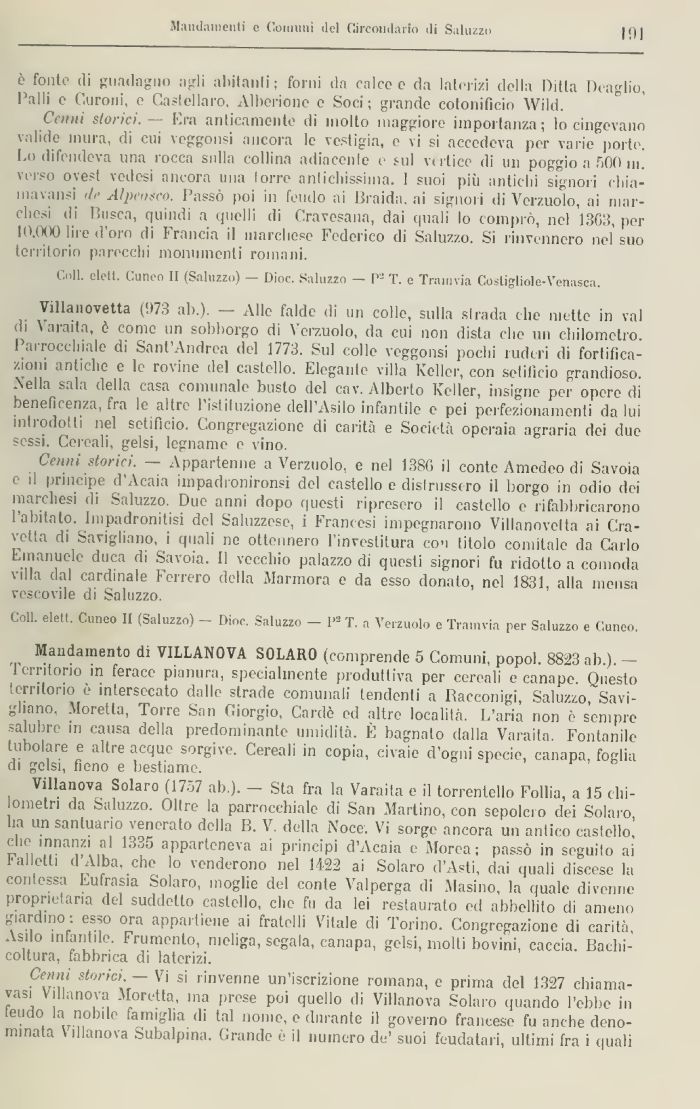 Villanova Solaro (1757 ab.). — Sta fra la Varaita e il torrentello Follia, a 15 chilometri da Saluzzo. Olire la parrocchiale di San Martino, con sepolcro dei Solaro, ha un santuario venerato della B. V. della Noce. Vi sorge ancora un antico castello, che innanzi al 1335 apparteneva ai principi d'Acaia e Morea ; passò in seguito ai Falletti d'Alba, che lo venderono nel 1422 ai Solaro d'Asti, dai quali discese la contessa Eufrnsia Solaro, moglie del conte Valperga di Masino, la quale divenne proprietaria del suddetto castello, clic fu da lei restaurato ed abbellito di ameno giardino: esso ora appartiene ai fratelli Vitale di Torino. Congregazione di carità, Asilo infantile. Frumento, meliga, segala, canapa, gelsi, molli bovini, caccia. Bachicoltura, fabbrica di laterizi.