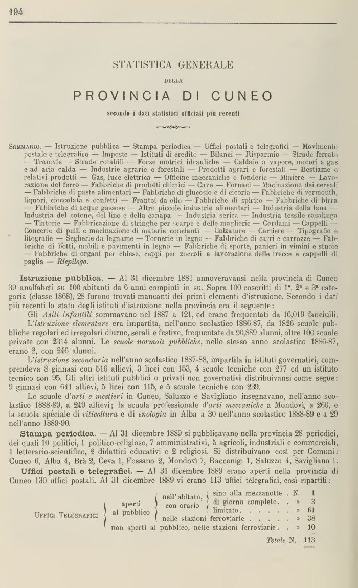 Uffici postali e telegrafici, Al 31 dicembre 1889 erano aperti nella provincia di Cuneo 130 uffici postali. Al 31 dicembre 1889 vi erano 113 uffici telegrafici, cosi ripartiti: