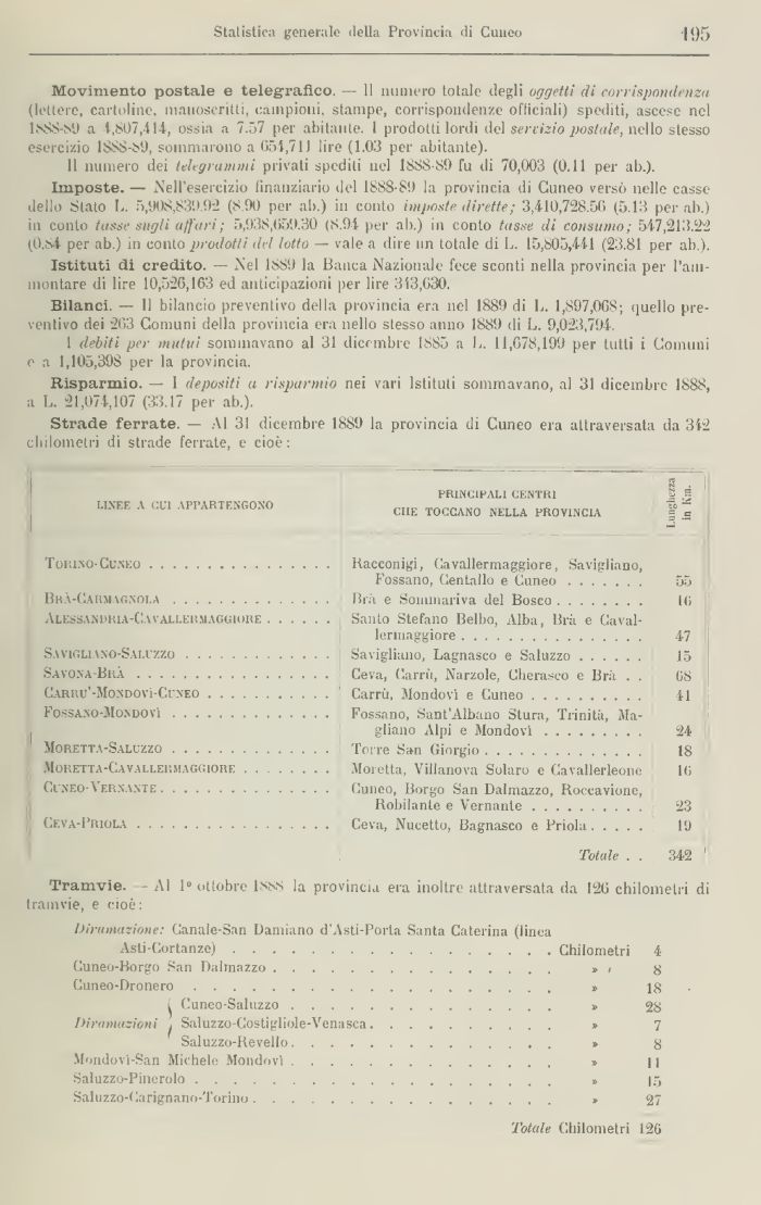 Strade ferrate. — Al 31 dicembre 1889 la provincia di Cuneo era attraversata da 312 chilometri di strade ferrate, e cioè: