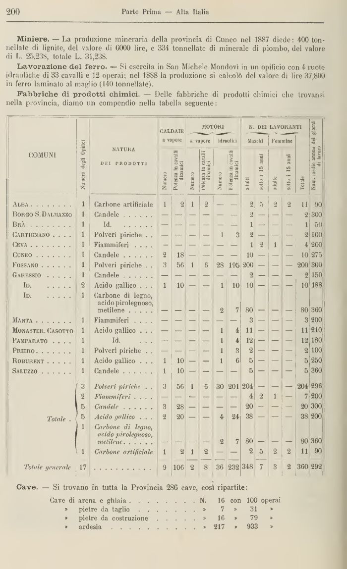 Miniere. La produzione mineraria della provincia di Cuneo nel 1887 diede: 400 ton-nellale di lignite, del valore ili (>000 lire, e 334 tonnellate di minerale di piombo, del valore di L 25,238, totale L. 31,ฎ!