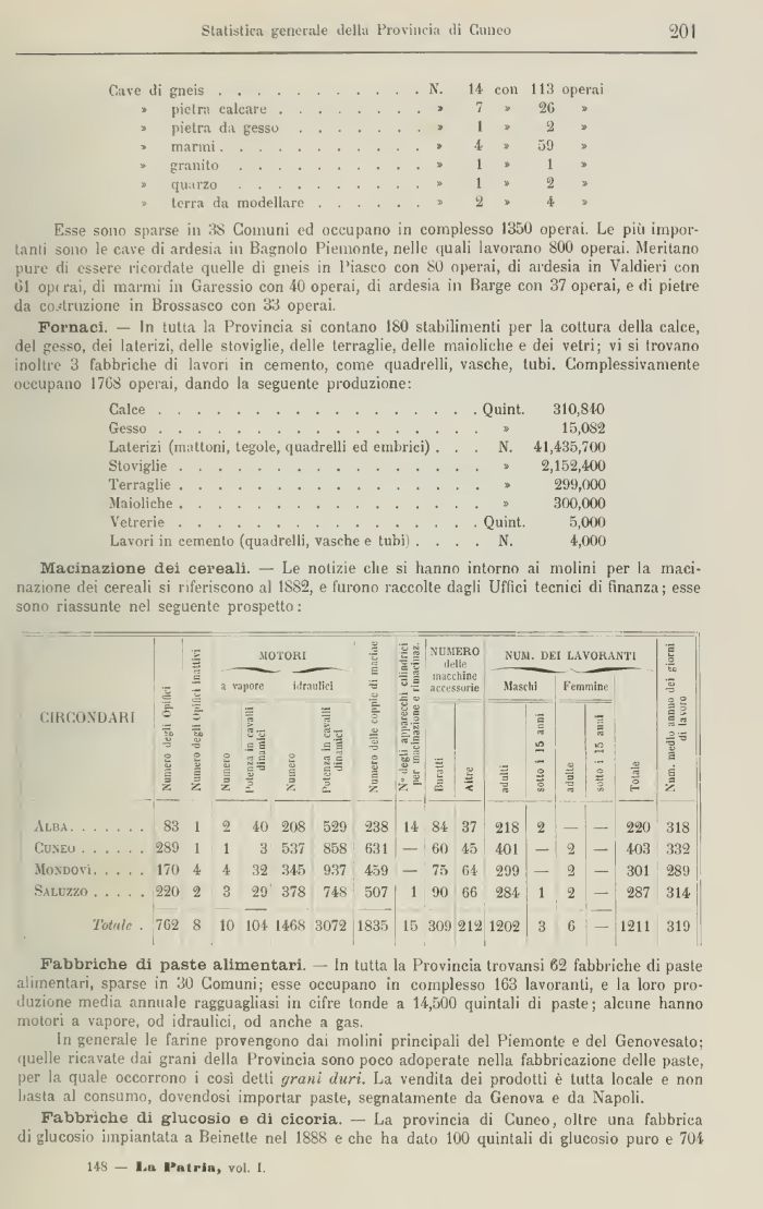 Fornaci. — In tutta la Provincia si contano 180 stabilimenti per la cottura della calce, del gesso, dei laterizi, delle stoviglie, delle terraglie, delle maioliche e dei vetri; vi si trovano inoltre 3 fabbriche di lavori in cemento, come quadrelli, vasche, tubi. Complessivamente occupano 1768 operai, dando la seguente produzione: