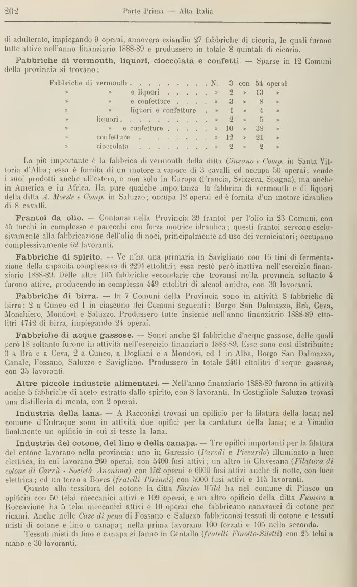 La più importante è la fabbrica di vermouth della ditta Cumino e Coinp. in Santa Vittoria d'Alba; essa è fornita di un motore a vapore di 3 cavalli ed occupa 50 operai; vende i suoi prodotti anche all'estero, e non solo in Europa (Francia, Svizzera, Spagna), ma anche iri America e in Africa. Ila pure qualche importanza la fabbrica di vermouth e di liquori della ditta A. Mnesle e Coinp. in Saluzzo; occupa 12 operai ed è fornita d'un motore idraulico di 8 cavalli.