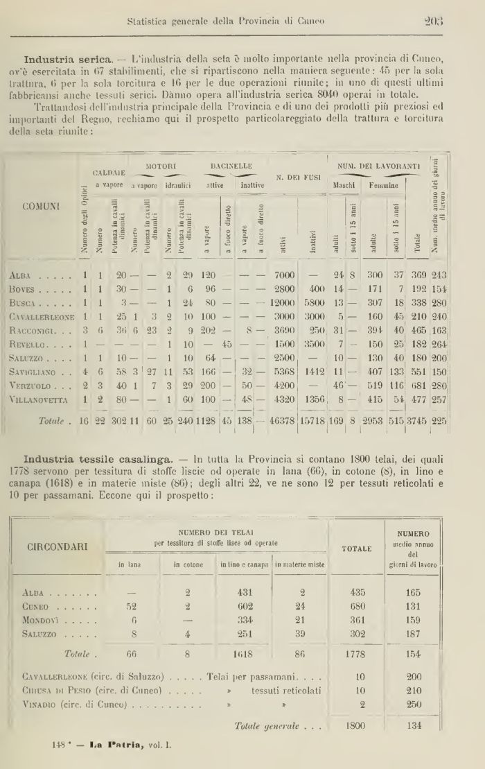 Industria serica. L'industria della scia θ molto importante nella provincia di Cinico, ov'ς esercitala in <>7 stabilimenti, che si ripartiscono nella maniera seguente : 45 per la sola trattura, li per la sola torcitura e MS per le due operazioni riunite; in uno di questi ultimi fabbricasi anche tessuti serici. Danno opera all'industria serica 8040 operai in totale.