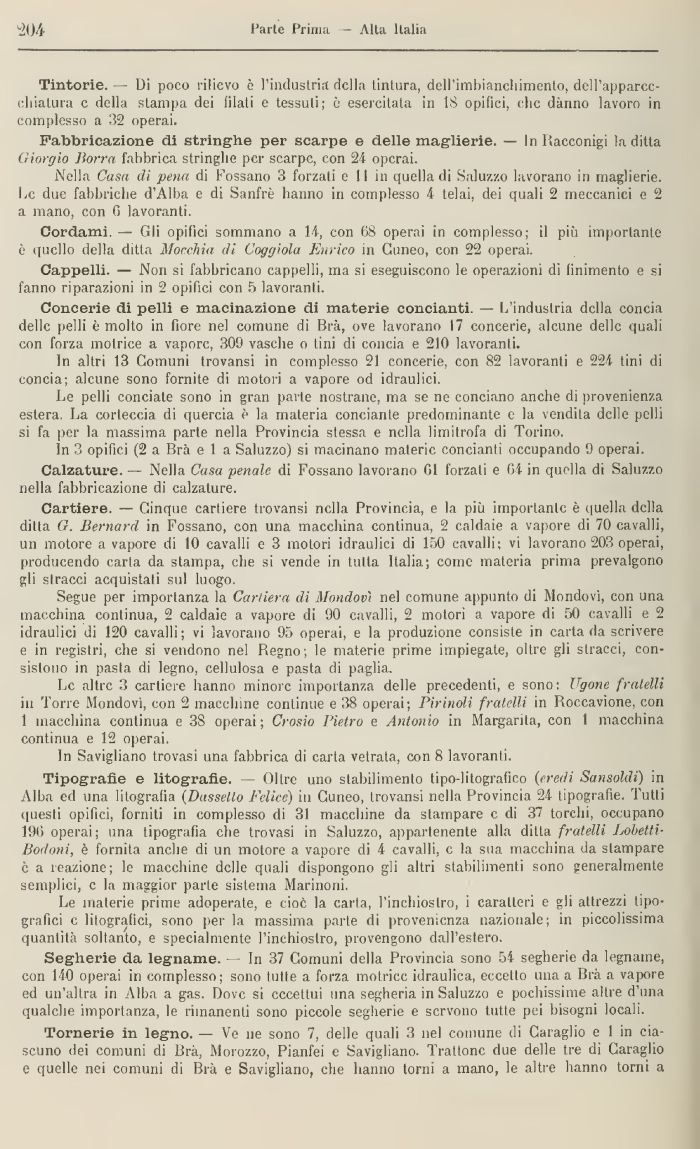 Cordami. — Gli opifìci sommano a 14, con 68 operai in complesso; il più importante è quello della ditta Morchia di Coggiola Enrico in Cuneo, con 22 operai.