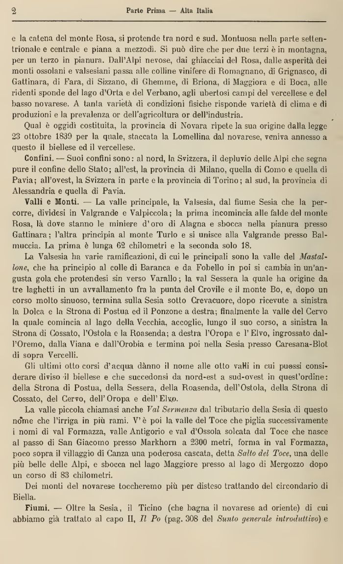 Valli e Monti — La valle principale, la Valsesia, dal fiume Sesia che la percorre, dividesi in Valgrande e Valpiccola; la prima incomincia alle falde del monte Rosa, là dove stanno le miniere d'oro di Alagna e sbocca nella pianura presso Gattinara ; l'altra principia al monte Torlo e si unisce alla Valgrande presso Bal-muccia. La prima è lunga 62 chilometri e la seconda solo 18,