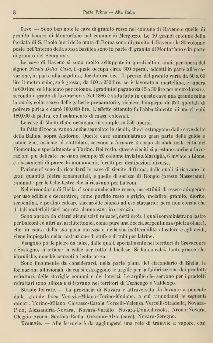 Le cave di Baveno si sono molto sviluppate in questi ultimi anni, per opera del signor Nicola Della Casa, il quale occupa circa 300 operai, addetti in parte all'esca-vazione, in parte alla segatura, lucidatura, ecc. Il prezzo del granito varia da 50 a G0 lire il metro cubo, se è grezzo, da 100 a 250 lire, se è lavorato a martellina, e supera le 600 lire, se è lucidato per colonne. 1 gradini si pagano da 15 a 30 lire per metro lineare, secondo il grado di lavorazione. Nel 1886 è stata fatta in queste cave una grande mina la quale, collo scavo delle gallerie preparatorie, richiese l'impiego di 370 quintali di polvere pirica e costò 100.000 lire. L'effetto ottenuto fu l'abbattimento di metri cubi 180,000 di pietra, coll'isolamento di massi colossali.