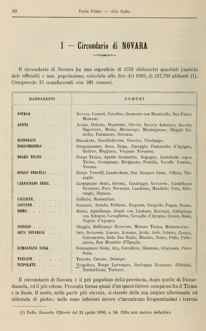 Il circondario di Novara ha una superficie di 1378 chilometri quadrati (antichi dati ufficiali) e una popolazione, calcolata alla fine del 1889, di 247,798 abitanti (1). Comprende 15 mandamenti con 104 comuni.