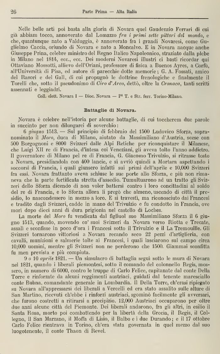 Nelle belle arti poi basta alla gloria di Novara quel Gaudenzio Ferrari di cui già abbiani tocco, annoverato dal Lomazzo fra i primi sette pittori del mondo, e che, quantunque nato a Valduggia, è annoverato fra i grandi Novaresi, come Guglielmo Caccia, oriundo di Novara e nato a Moncalvo. E in Novara nacque anche Giuseppe Prina, celebre ministro del Regno Italico Napoleonico, straziato dalla plebe in Milano nel 1814, ecc., ecc. Dei moderni Novaresi illustri ci basti ricordar qui Ottaviano Mossotti, allievo dell'Oriani, professore di fisica a Buenos Avres, a Corfù, all'Università di Pisa, ed autore di parecchie dotte memorie ; G. A. Fossati, amico del Rasoi 1 e del Gali, di cui propugnò le dottrine frenologiche e finalmente il Torelli che, sotto il pseudonimo di Ciro d'Arco, dettò, oltre la Cronaca, tanti scritti assennati e leggiadri.