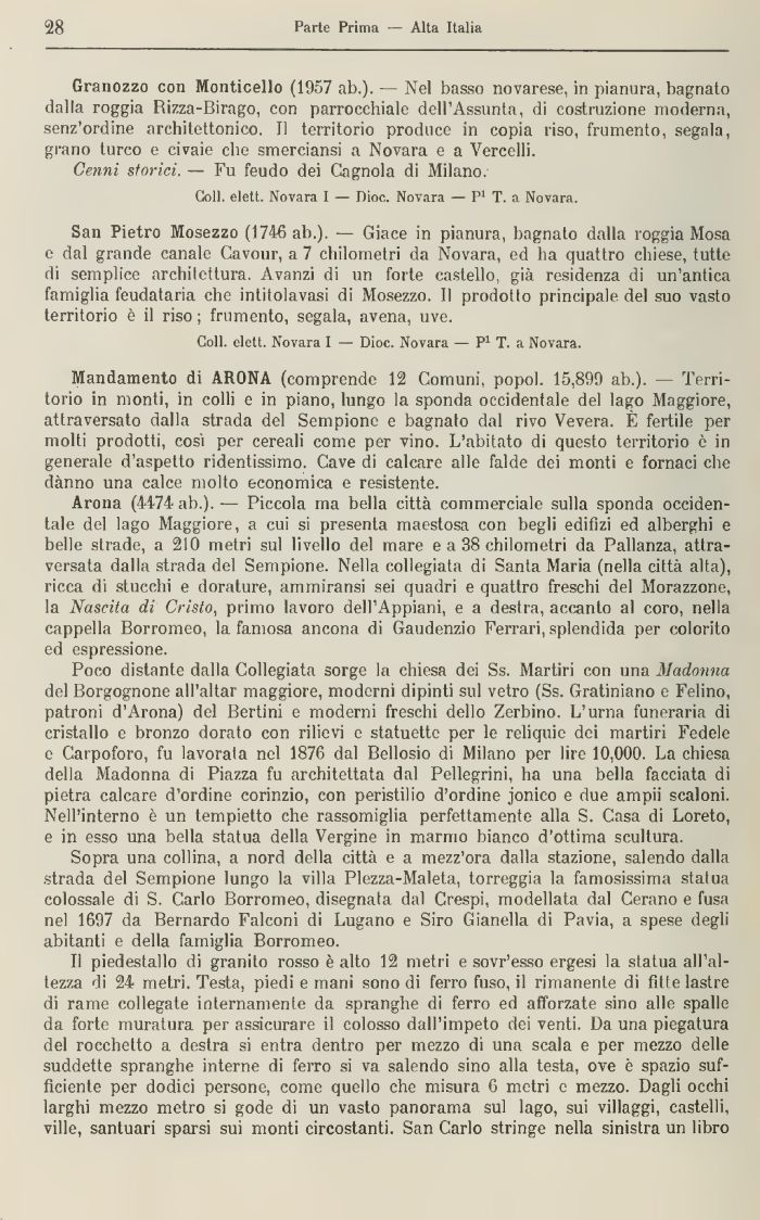 Arona (4174 ab.).— Piccola ma bella città commerciali sulla sponda occidentale del lago Maggiore, a cui si presenta maestosa con begli edilizi ed alberghi e belle strade, a 210 metri sul livello del mare e a 38 chilometri da Pallanza, attraversata dalla strada del Sempione. Nella collegiata di Santa Maria (nella città alta), ricca di stucchi e dorature, ammiratisi sei quadri e quattro freschi del Morazzone, la Nascita di Cristo, primo lavoro dell'Appiani, e a destra, accanto al coro, nella cappella Borromeo, la famosa ancona di Gaudenzio Ferrari, splendida per colorito ed espressione.