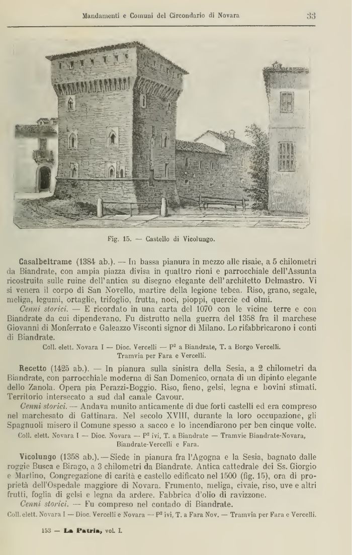 Vicolungo (1358 ab.). —Siede in pianura fra l'Agogna e la Sesia, bagnato dalle roggie Busca e Birago, a 3 chilometri da Biandrate. Antica cattedrale dei Ss. Giorgio e Martino, Congregazione di carità e castello edificato nel 1500 (fig. 15), ora di proprietà dell'Ospedale maggiore di Novara. Frumento, meliga, civaie, riso, uve e altri frutti, foglia di gelsi e legna da ardere. Fabbrica d'olio di ravizzone.
