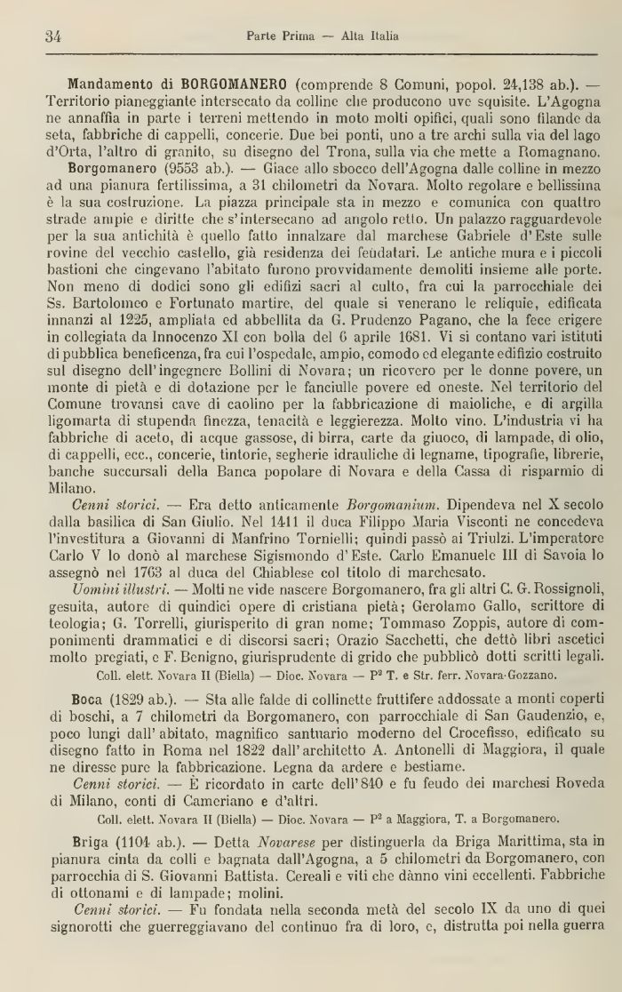 Borgomanero (9553 ab.). — Giace allo sbocco dell'Agogna dalle colline in mezzo ad una pianura fertilissima, a 3i chilometri da Novara. Molto regolare e bellissima è la sua costruzione. La piazza principale sta in mezzo e comunica con quattro strade ampie e diritte che s'intersecano ad angolo retto. Un palazzo ragguardevole per la sua antichità è quello fatto innalzare dal marchese Gabriele d'Este sulle rovine del vecchio castello, già residenza dei feudatari. Le antiche mura e i piccoli bastioni che cingevano l'abitato furono provvidamente demoliti insieme alle porte. Non meno di dodici sono gli edifìzi sacri al culto, fra cui la parrocchiale dei Ss. Bartolomeo e Fortunato martire, del quale si venerano le reliquie, edificata innanzi al 1225, ampliata ed abbellita da G. Prudenzo Pagano, che la fece erigere in collegiata da Innocenzo XI con bolla del fi aprile 1681. Vi si contano vari istituti di pubblica beneficenza, fra cui l'ospedale, ampio, comodo ed elegante edifizio costruito sul disegno dell'ingegnere Bollini di Novara; un ricovero per le donne povere, un monte di pietà e di dotazione per le fanciulle povere ed oneste. Nel territorio del Comune trovansi cave di caolino per la fabbricazione di maioliche, e di argilla lìgomarta di stupenda finezza, tenacità e leggierezza. Molto vino. L'industria vi ha fabbriche di aceto, di acque gassose, di birra, carte da giuoco, di lampade, di olio, di cappelli, ecc., concerie, tintorie, segherie idrauliche di legname, tipografìe, librerie, banche succursali della Banca popolare di Novara e della Cassa di risparmio di Milano.