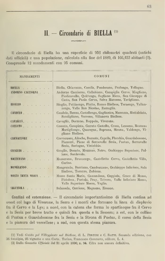 11 circondario di Biella ha una superficie di 952 chilometri quadrati (antichi dati ufficiali) e una popolazione, calcolata alla fine del 1889, di 100,453 abitanti (2). Comprende 12 mandamenti con 95 comuni.