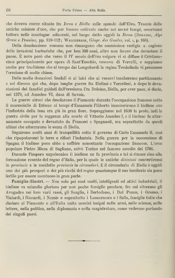 Famiglie illustri. — Non solo pei suoi molti, intelligenti ed attivi industriali, il biellese va eziandio glorioso per non poche famiglie preclare, fra cui citeremo gli Avogadro nei loro varii rami, gli Scaglia, i Bertodano, i Dal Pozzo, i Cromo, i Vialardi, i Riccardi, i Nornis e soprattutto i Lamarmora e i Sella, famiglie tutte che diedero al Piemonte e all'Italia unita uomini insigni nelle armi, nelle scienze, nelle lettere, nella politica, nella diplomazia e nella magistratura, come vedremo parlando dei singoli paesi.