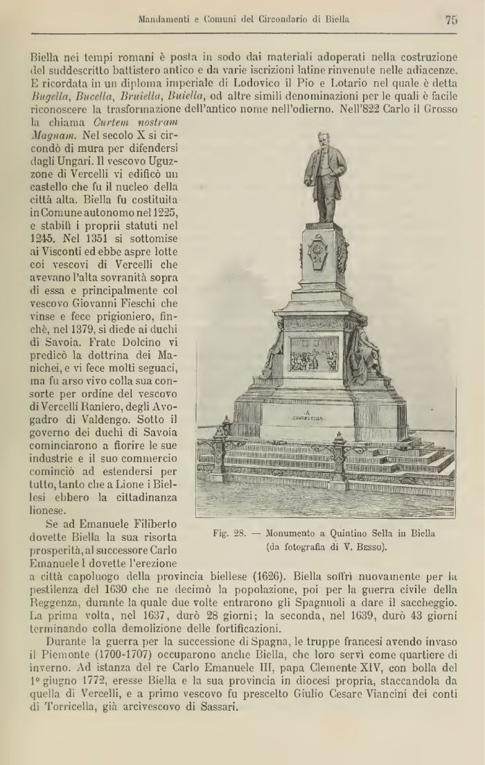 Biella nei tempi romani è posta in sodo dai materiali adoperati nella costruzione del suddescritlo battistero antico e da varie iscrizioni latine rinvenute nelle adiacenze. E ricordata in un diploma imperiale di Lodovico il Pio e Lotario nel quale è detta Bugella, Bucella, Bmiella, limetta, od altre simili denominazioni per le quali è facile riconoscere la trasformazione dell'antico nome nell'odierno. Nell'822 Carlo il Grosso la chiama Curtem nostrani Magnani. Nel secolo X si circondò di mura per difendersi dagli Ungari. Il vescovo Uguz-zone dì Vercelli vi edificò un castello che fu il nucleo della città alta. Biella fu costituita in Comune autonomo nel 1225, e stabilì i proprii statuti nel 1245. Nel 1351 si sottomise ai Visconti ed ebbe aspre lotte coi vescovi di Vercelli che avevano l'alta sovranità sopra di essa e principalmente col vescovo Giovanni Fieschi che vinse e fece prigioniero, finché, nel 1379, si diede ai duchi di Savoia. Frate Dolcino vi predicò la dottrina dei Manichei, e vi fece molti seguaci, ma fu arso vivo colla sua consorte per ordine del vescovo di Vercelli Raniero, degli Avo-gadro di Valdengo. Sotto il governo dei duchi di Savoia cominciarono a fiorire le sue industrie e il suo commercio cominciò ad estendersi per tutto, tanto che a Lione i Biel-lesi ebbero la cittadinanza lionese.