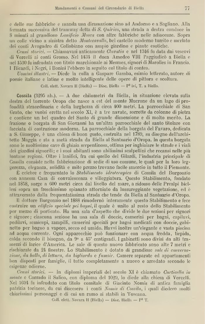 Cossila (3295 ab.). — A due chilometri da Biella, in situazione elevata sulla destra del torrente Oropa che nasce a est del monte Mucrone da un lago di profondità straordinaria e della larghezza di circa 400 metri. La parrocchiale di San Grato, che vuoisi eretta nel secolo XI, è a tre navate, sorrette da colonne di pietra e contiene un bel quadro del Santo di grande dimensione e di molto merito. La frazione o borgata di San Giovanni ha un'altra parrocchiale del santo titolare con facciata (li costruzione moderna. La parrocchiale della borgata del Favaro, dedicata a S. Giuseppe, è una chiesa di buon gusto, costruita nel 1789, su disegno dell'architetto Maggia e sta a metà strada da Biella al Santuario d'Oropa. In questa borgata sono le moltissime cave di ghiaia serperliinosa, ottima per inghiaiare le strade e i viali dei giardini signorili; e i suoi abitanti sono abilissimi scalpellini che recansi nelle più lontane regioni. Oltre i lanifici, fra cui quello del Giiardi, l'industria principale di Gossila consiste nella fabbricazione di sedie di uso comune, le quali per la loro leggerezza, eleganza, solidità e mite prezzo trovano facile smercio in tutto il Piemonte.