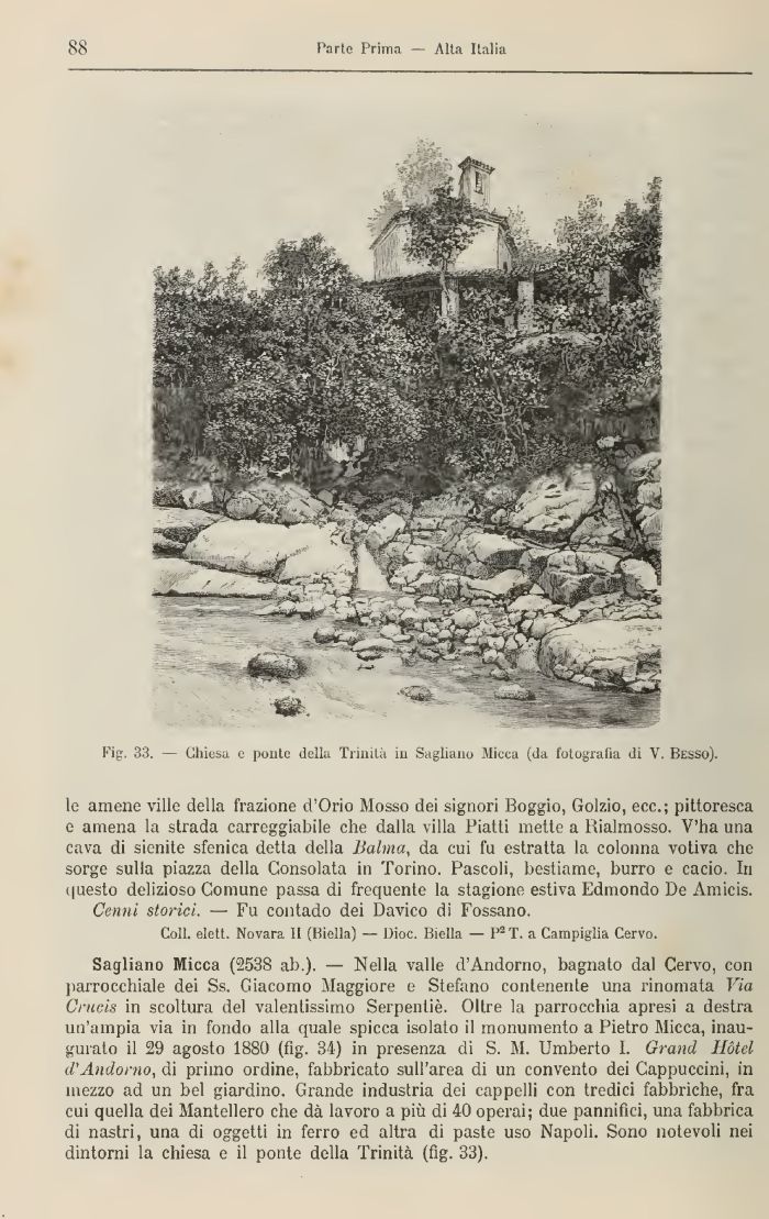 Sagliano Micca (2538 ab.), — Nella valle d'Andorno, bagnato dal Cervo, con parrocchiale dei Ss. Giacomo Maggiore e Stefano contenente una rinomata Via Crucis in scoltura del valentissimo Serpentiè. Oltre la parrocchia apresi a destra un'ampia via in fondo alla quale spicca isolato il monumento a Pietro Micca, inaugurato il 29 agosto 1880 (fig. 34) in presenza di S. M. Umberto I. Grand Hotel d'Andorno, di primo ordine, fabbricato sull'area di un convento dei Cappuccini, in mezzo ad un bel giardino. Grande industria dei cappelli con tredici fabbriche, fra cui quella dei Mantellero che dà lavoro a più di 40 operai; due pannifici, una fabbrica di nastri, una di oggetti in ferro ed altra di paste uso Napoli. Sono notevoli nei dintorni la chiesa e il ponte della Trinità (fig. 33).