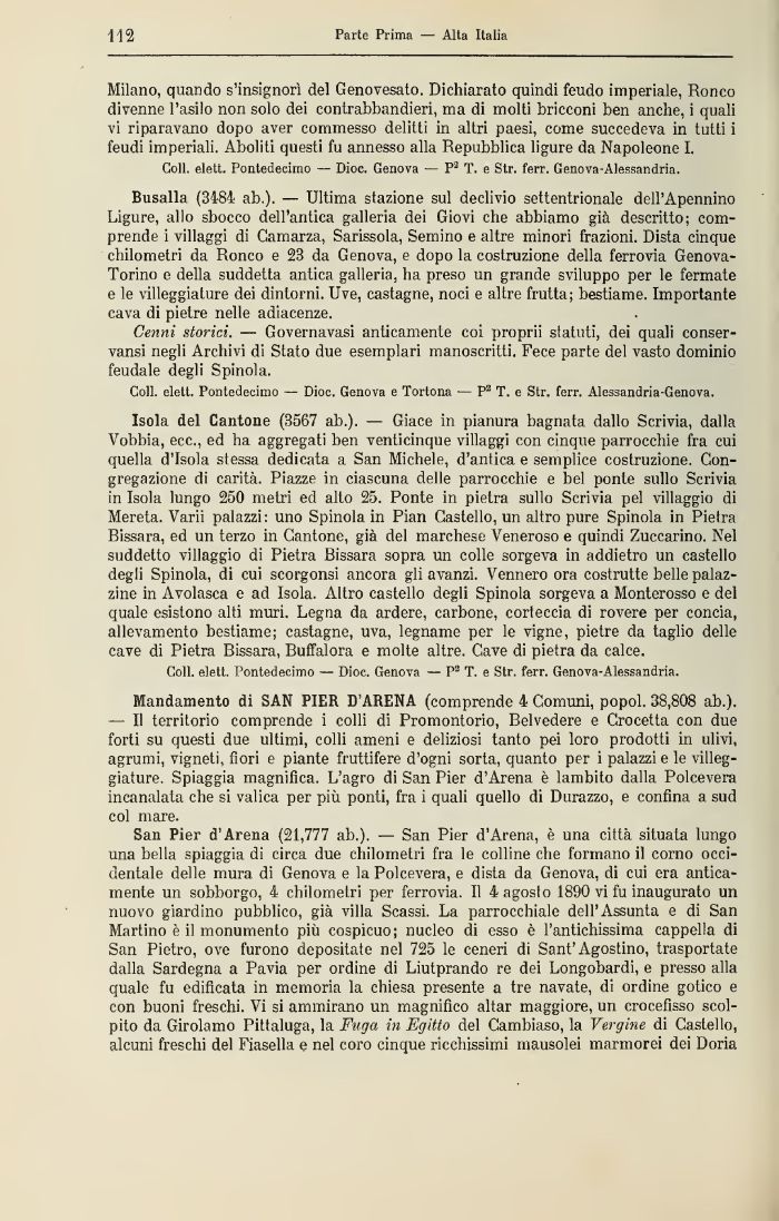quanto per i palazzi e le villeggiature. Spiaggia magnifica. L'agro di San Pier d'Arena è lambito dalla Polcevera incanalata che si valica per più ponti