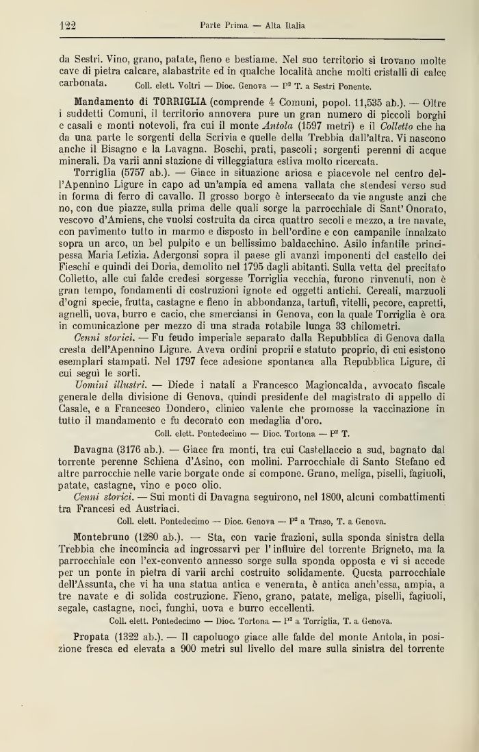 Torriglia (5757 ab.). - Giace in situazione ariosa e piacevole nel centro del-l'Apennino Ligure in capo ad un'ampia ed amena vallata che stendesi verso sud in forma di ferro di cavallo. Il grosso borgo ่ intersecato da vie anguste anzi che no