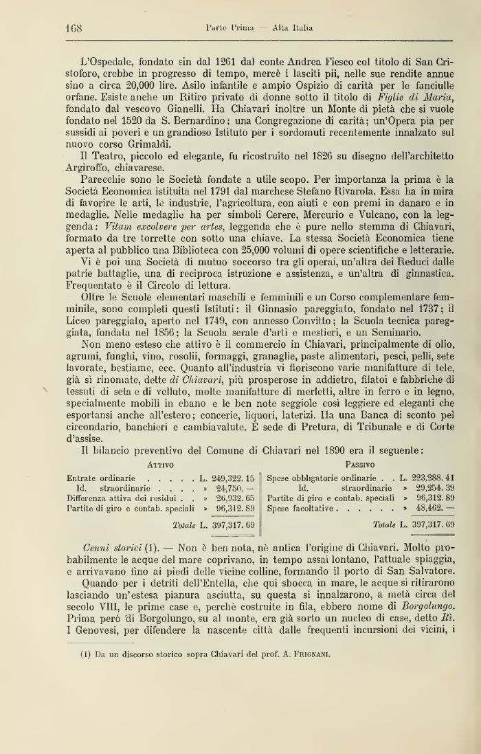 Il bilancio preventivo del Comune di Chiavari nel 1890 era il seguente: Attivo Passivo