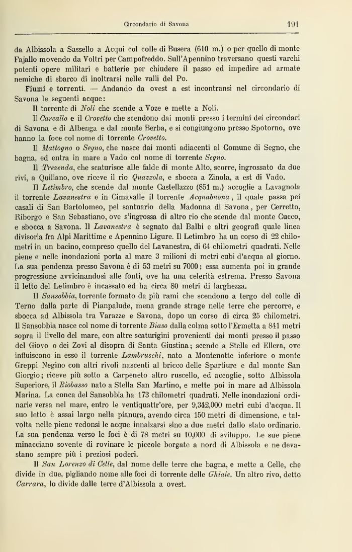 000 di sviluppo. Le sue piene minacciano sovente di rovinare le piccole borgate a nord di Albissola e ne devastano sempre pių i preziosi poderi.