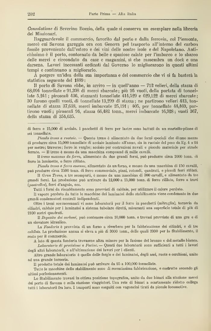 18-2 Parte Prima — Alta Italia Piccolo treno ci ruotale. — Questo treno è alimentato da due forni speciali clic danno mezzo di produrre circa 15 000 tonnellate di acciaio laminato all'anno sia in ruotaie del peso da Kg. 4 a 24 por metro; traverse; ferro in verghe; acciaio per costruzioni navali e piccolo materiale per strade ferrate. — Il treno è mosso da una macchina compound di mille cavalli. 11 treno mezzano da ferro alimentato da due grandi forni può produrre circa 1000 tonn. di ferro in laminelte o ferro rifilato. Piccolo treno a. ferro comune alimentato da un forno e mosso da una macchina di 150 cavalli può produrre circa 3500 tomi di ferro commerciale piani rotondi quadrati e piccoli ferri rifilali. Il Gran Treno a tre scomparti è mosso da una macchina di 300 cavalli e alimentato da tre grandi forni. La produzione può arrivare da 12 000 a 15 000 tonn. di ferro rifilato ferro a travi {potitrclles) ferri d'angolo ecc. Tutti i forni da riscaldamento sono provvisti di caldaie per utilizzare il calore perduto. Il vapore perduto da tutte le macchine dei laminatoi dello stabilimento viene condensato in duo grandi condensatori centrali indipendenti. Oltre i treni sovraccennati vi sono laboratori! per il ferro in pacchetti (mitraglia) torneria da cilindri caldaie per i laminatoi a sistema tubolare diretti misuranti una superficie totale di più di 2100 metri quadrati. 11 Deposito dei carboni può contenere circa 10 000 tonn. e trovasi provvisto di una gru e di un elevatore idraulico. La Fonderia è provvista di un forno a riverbero per la fabbricazione dei cilindri e di tre cubilots. La produzione annua si eleva a più di 3000 tonn. delle quali 2000 per lo Stabilimento il resto per il commercio. A lato di questa fonderia trovasene altra minore per la fusione del bronzo e del metallo bianco. Laboratorio di precisione e Fucine — Questi due laboratori sono sufficienti a lutti i lavori degli altri laboratorii e all'ultimazione dei lavori per i clienti. Altro grande laboratorio è quello delle f'orgie e dei laminatoi degli assi ruoto e cerchioni unito ad una grande torneria. 11 prodotto totale dei laminatoi può arrivare da U5 a 100 000 tonnellate. Tutte le macchine dello stabilimento sono di recentissima fabbricazione e costrutte secondo gli ultimi perfezionamenti. Lo Stabilimento trovasi in ottima posizione topografica unito da due binari alla stazione merci dal porto di Savona e colla staziono viaggiatori. Una rote di binari a scartamento ridotto collega tutti i laboratorii fra loro. I trasporti sono eseguiti con vagoncini tirati da piccole locomotive. ![]() |