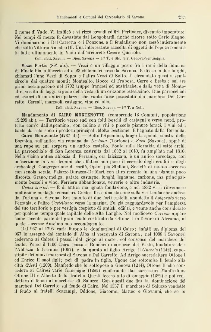 e il feudalismo non cessò intieramente che sotto ViLtorio Amedeo III. Una interessante raccolta di oggetti dell'epoca romana fu fatta ultimamente in Vado dall'arciprete Cesare Qucirolo.