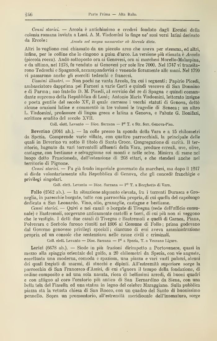 Beverino (3011 ab.). — In colle presso la sponda della Vara e a 15 chilometri da Spezia. Comprende varie villate