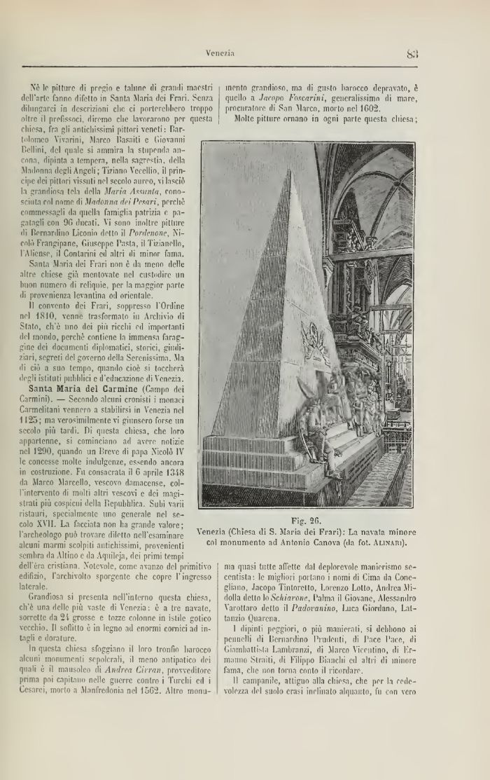 Il convento dei Frari, soppresso l'Ordine nel 18IO, venne trasformalo in Archivio di Stato, ch'ò lino dei più ricchi ed importanti del mondo, perchè contiene la immensa favaggine dei documenti diplomatici, storici, giudiziari, segreti del governo della Serenissima. Ma di ciò a suo tempo, quando cioè si toccherà degli istituti pubblici e d'edneazione di Venezia.