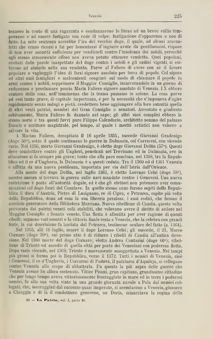 tennero in conto di una ragazzata e condannarono lo Steno ad un breve esilio temporaneo e ad essere fustigato con code di volpe: fustigazione d'apparenza e non di fatto. La mite sentenza accrebbe F ira del vecchio doge, il quale, ad alcuni arsenalotti che erano ricorsia lui per lamentarsi d'ingiurie avute da gentiluomini, rispose di non aver autorità sufficiente per vendicarli contro l'insolenza dei nobili, perocché egli stesso atrocemente ofl'eso 11011 aveva potuto ottenere vendetta. Quei popolani, eccitati dalle parole inaspettate del doge contro i nobili e gli ordini vigenti, si esibirono ad aiutarlo nella sua vendetta. Parve al Fallerò di avere con sè il favore popolare e vagheggiò l'idea di farsi signore assoluto per forza di popolo. Gol nipote ed altri suoi famigliari e malcontenti congiurò sul modo di chiamare il popolo m armi contro i nobili, sopprimere il Maggior Consiglio, incarcerandolo in un giorno di radunanza e proclamare poscia Marin Fallerò signore assoluto di Venezia. IX ebbero sentore della cosa, nell'imminenza che la trama passasse in azione. La cosa parve ad essi tanto grave, di capitale importanza, e per la necessità che s'imponeva d'agire rapidamente senza indugi e pietà, credettero bene aggiungere alla loro autorità quella di altri venti patrizi, membri del Gran Consiglio o senatori. Arrestato e giudicato subitamente, Marin Fallerò fu dannato nel capo; gli altri suoi complici ebbero la stessa sorte e tra questi fuvvi pure Filippo Calendario, architetto sommo del palazzo Ducale e scrittore magistrale, pel tempo, al quale i meriti artistici non valsero a salvare la vita.