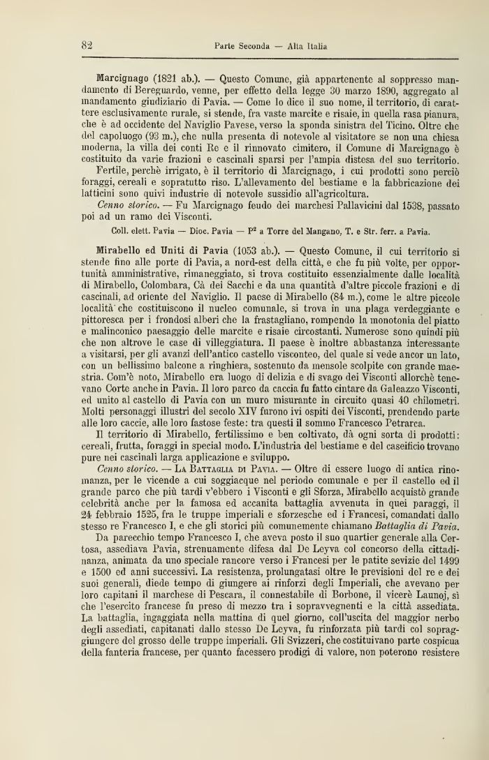 Marcignago (1821 ab.) — Questo Comune, già appartenente al soppresso mandamento di Beroguardo, venne, per effetto della legge 30 marzo 1890, aggregato al mandamento giudiziario di Pavia. — Come lo dice il suo nomo, il territorio, di carattere esclusivamente rurale, si stende, fra vaste marcite e risaie, in quella rasa pianura, c.lie è ad occidente del Naviglio Pavese, verso la sponda sinistra del Ticino. Oltre che del capoluogo (93 ni.), che nulla presenta di notevole al visitatore se non una chiesa moderna, la villa dei conti Re e il rinnovato cimitero, il Comune di Marcignago è costituito da varie frazioni e cascinali sparsi per l'ampia distesa del suo territorio.