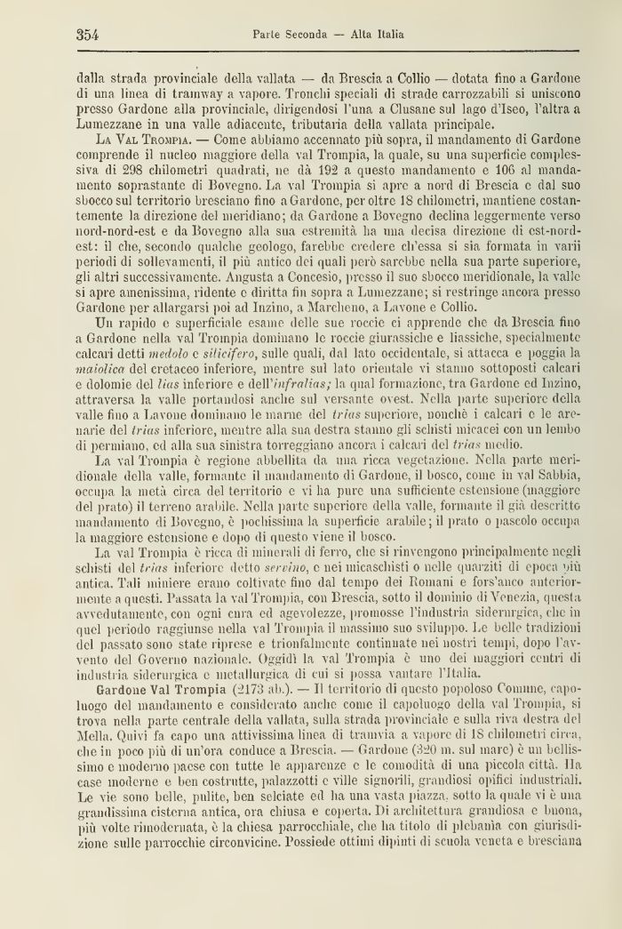 La Val Trompia. — Come abbiamo accennato più sopra, il mandamento di Gardone comprende il nucleo maggiore della vai Trompia, la quale, su una superficie complessiva di 298 chilometri quadrati, ne dà 192 a questo mandamento e 106 al mandamento soprastante di Bovegno. La vai Trompia si apre a nord di Brescia e dal suo sbocco sul territorio bresciano fino a Gardone, per oltre 18 chilometri, mantiene costantemente la direzione del meridiano; da Gardone a Bovegno declina leggermente verso nord-nord-est e da Bovegno alla sua estremità ha una decisa direzione di est-nordest: il che, secondo qualche geologo, farebbe credere ch'essa si sia formata in varii periodi di sollevamenti, il più antico dei quali però sarebbe nella sua parte superiore, gli altri successivamente. Angusta a Concesio, presso il suo sbocco meridionale, la valle si apre amenissima, ridente e diritta fin sopra a Lumezzane; si restringe ancora presso Gardone per allargarsi poi ad Inzino, a Marcheno, a Lavone e Collio.