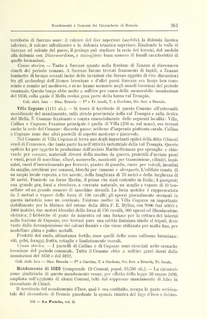Nel Comune di Villa Cogozzo si trova uno degli importanti opifici della ditta Glisenti eredi di Francesco, clic tanta parte lia nell'attività industriale della vai Trompia, Questo opifìcio ha per oggetto la produzione dell'acciaio Martin-Siemens per spranghe e chiavarde per corazze, materiali diversi della marina da guerra, proiettili d'acciaio pieni e vuoti, pezzi ili macchine, alberi, manovelle, manicotti per trasmissione, cilindri, laminatoi, cuori d'incrociamento per ferrovie, piastre di guardia, ruote per veicoli, incudini da maglio, cerchioni per cannoni, blocchi per cannoni e shrapnels. L'edilizio consta di un ampio locale coperto, a tre navate, della lunghezza di 70 metri e della larghezza di 30 metri. Possiede un forno Martin, il primo che siasi costrutto in Italia; 4 gazogeni, una grande gru, forni a riverbero, a corrente naturale, un maglio a vapore eli 10 tonnellate ed un grande numero di macchine utensili La forza motrice è rappresentata da 3 motori a vapore della forza di 100 cavalli ; gli operai giornalmente occupati 111 questa industria sono un centinaio. Esistono inoltre 111 Villa Cogozzo un importante stabilimento per la filatura del cotone della ditta E. E. Mylius, con 9000 fusi attivi e 1000 inattivi, due motori idraulici della forza di 150 cavalli, 300 operai ed illuminazione elettrica; 2 fabbriche di paste da minestra ed una fornace per la cottura dei laterizi nella frazione di Cogozzo, ove trovasi pure una sabbia finissima simile al tripoli, derivante dalla decomposizione dei calcari Massici e che viene utilizzata per malta fina, per modellare ghisa e pulire metalli.