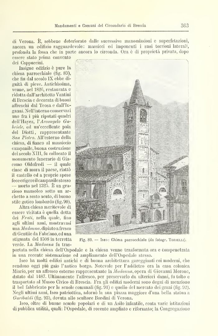 Insigne edilizio è pure la chiesa parrocchiale (fig. 89), che fin dal secolo IX ebbe dignità di pieve. Antichissima, venne, nel 1826, restaurata e ridotta dall'architetto Vantini di Brescia e decorata di buoni affreschi dal Teosa e dall'Inganni. Nell'interno conservasi uno fra i più riputati quadri dell'Hayez, VArcangelo Gabriele, ed un'eccellente pala del Diotti, rappresentante San Pietro. All'esterno della chiesa, di fianco al massiccio campanile, buona costruzione del secolo XIII, fu collocato il monumento funerario di Giacomo Oldofredi — il quale cinse di mura il paese, riattò il castello ed a proprie spese fece erigere il campanile stesso — morto nel 1325. È un grazioso mausoleo sotto un archetto a sesto acuto, di buono stile gotico lombardo (fig. 90).