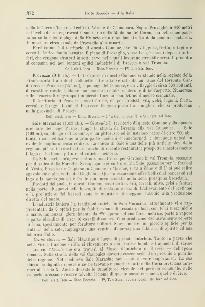 Sale Marasino (10GB ab.). — Si stende il territorio di questo Comune sulla sponda orientale del lago d'Iseo, lungo la strada da Brescia alla vai Camonica. — Sale ( 100 in.), capoluogo del Comune, è un pittoresco ed industrioso paese di oltre 900 abitanti: i suoi edifizi sono in gran parte moderni o rimodernati, e dovunque notasi un evidente miglioramento edilizio. La chiesa di Sale è una delle più antiche pievi della regione, più volte ricostrutta ed anche di recente restaurata: prospetta maestosamente il lago ed ha buone pitture ed antiche memorie.