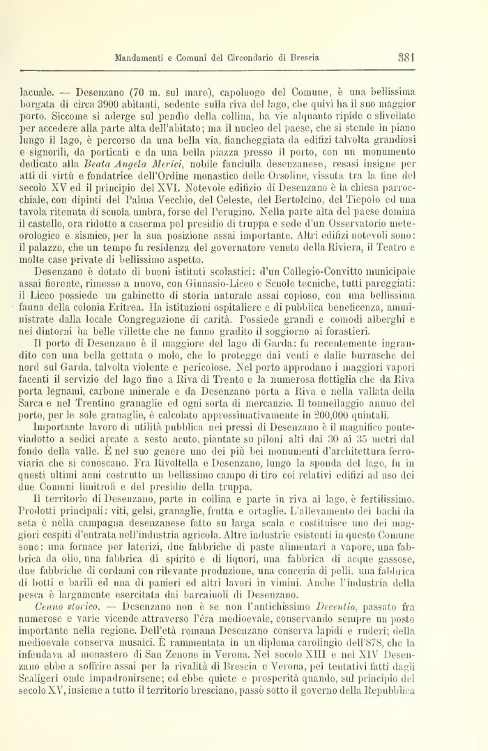 lacuale. — Desenzano (70 ni. sul mare), capoluogo del Comune, è una bellissima borgata di circa 3900 abitanti, sedente sulla riva del lago, che quivi ha il suo maggior porto. Siccome si aderge sul pendìo della collina, ha vie alquanto ripide e slivellate per accedere alla paite alta dell'abitato; ma il nucleo del paese, che si stende in piano lungo il lago, è percorso da una bella via, fiancheggiata da edilizi talvolta grandiosi e signorili, da porticati e da una bella piazza presso il porto, con un monumento dedicato alla Beata Angela Meriti, nobile fanciulla desenzanese, resasi insigne per atti di virtù e fondatrice dell'Ordine monastico delle Orsoline, vissuta tra la line del secolo XV ed il principio del XVI. Notevole edilizio di Desenzano è la chiesa parrocchiale, con dipinti del Palma Vecchio, del Celeste, del Bertolcino, del Tiepolo ed una tavola ritenuta di scuola umbra, forse del Perugino. Nella parte alta del paese domina il castello, ora ridotto a caserma pel presidio di truppa e sede d'un Osservatorio meteorologico e sismico, per la sua posizione assai importante. Altri edifizi notevoli sono : il palazzo, che un tempo fu residenza del governatore veneto della Riviera, il Teatro e molte case private di bellissimo aspetto.
