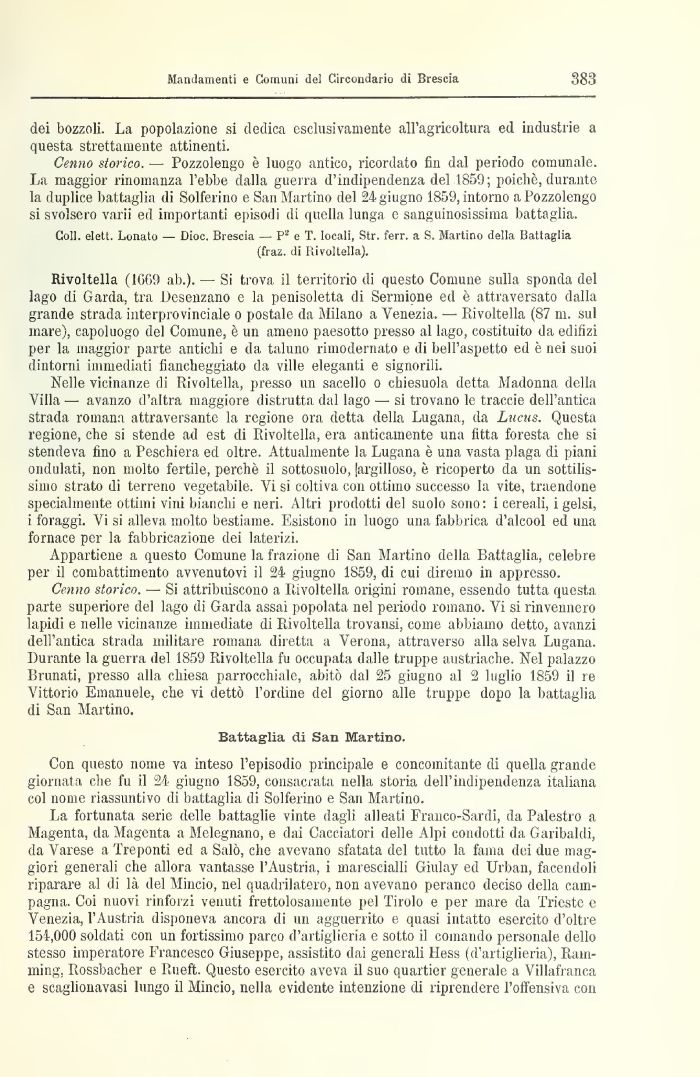 Rivoltella (1669 ali.). — Si trova il territorio di questo Comune sulla sponda del lago di Garda, tra Desenzano e la penisoletta di Sennione ed è attraversato dalla grande strada interprovinciale o postale da Milano a Venezia. — Rivoltella (87 ni. sul mare), capoluogo del Comune, è un ameno paesotto presso al lago, costituito da edifizi per la maggior parte antichi e da taluno rimodernato e di bell'aspetto ed è nei suoi dintorni immediati fiancheggiato da ville eleganti e signorili.