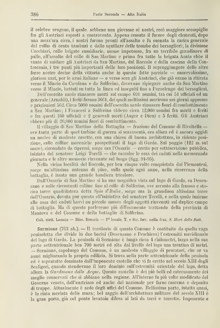Dall'Ossario ili San Martino sì ha una magnifica vista sul lago di Garda, sn Desen-zano e sulle circostanti colline lino al colle di Solferino, ove accanto alla famosa e stanca torre quadrilatera detta Spia d'Italia, sorge ora la grandiosa altissima torre dell'Ossario, dovuta pur questa all'iniziativa del senatore Torelli, e nella quale insieme alle ossa dei caduti lumi 1111 piccolo museo degli oggetti rinvenuti sul duplico campo di battaglia. Ma di questo parleremo più diffusamente trattando della provincia di Mantova e del Comune e della battaglia di Solferino.