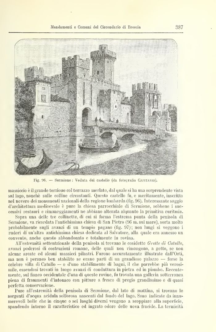 massiccio è il grande torrione col terrazzo merlato, dal quale si Ira una sorprendente vista sul lago, nonché sulle colline circostanti. Questo castello fu, e meritamente, inscritto nel novero dei monumenti nazionali della regione lombarda (fig. 96). Interessante saggio d'architettura medioevale è pure la chiesa parrocchiale di Serniione, sebbene i successivi restauri e rimaneggiamenti ne abbiano alterata alquanto la primitiva euritmia.